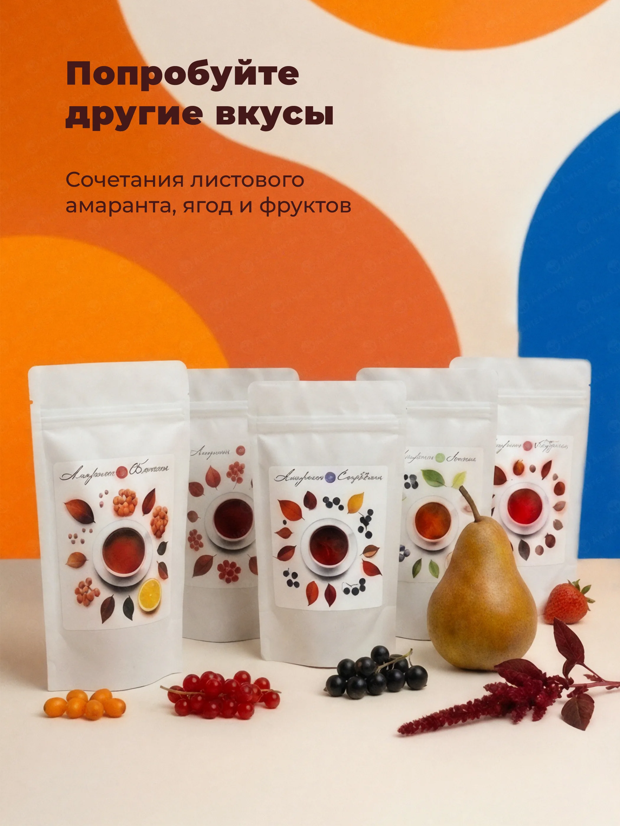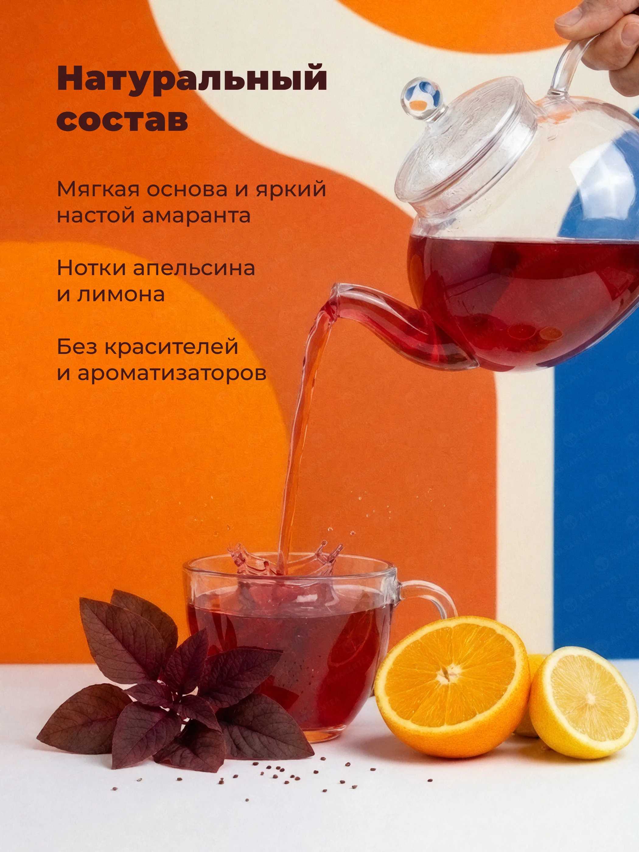 Натуральный листовой напиток без кофеина, сахара и искусственных добавок. В основе — красный амарант, выращенный в России без использования пестицидов и гербицидов. Мы бережно сушим листья и смешиваем их с настоящим сушеным апельсином и лимоном.