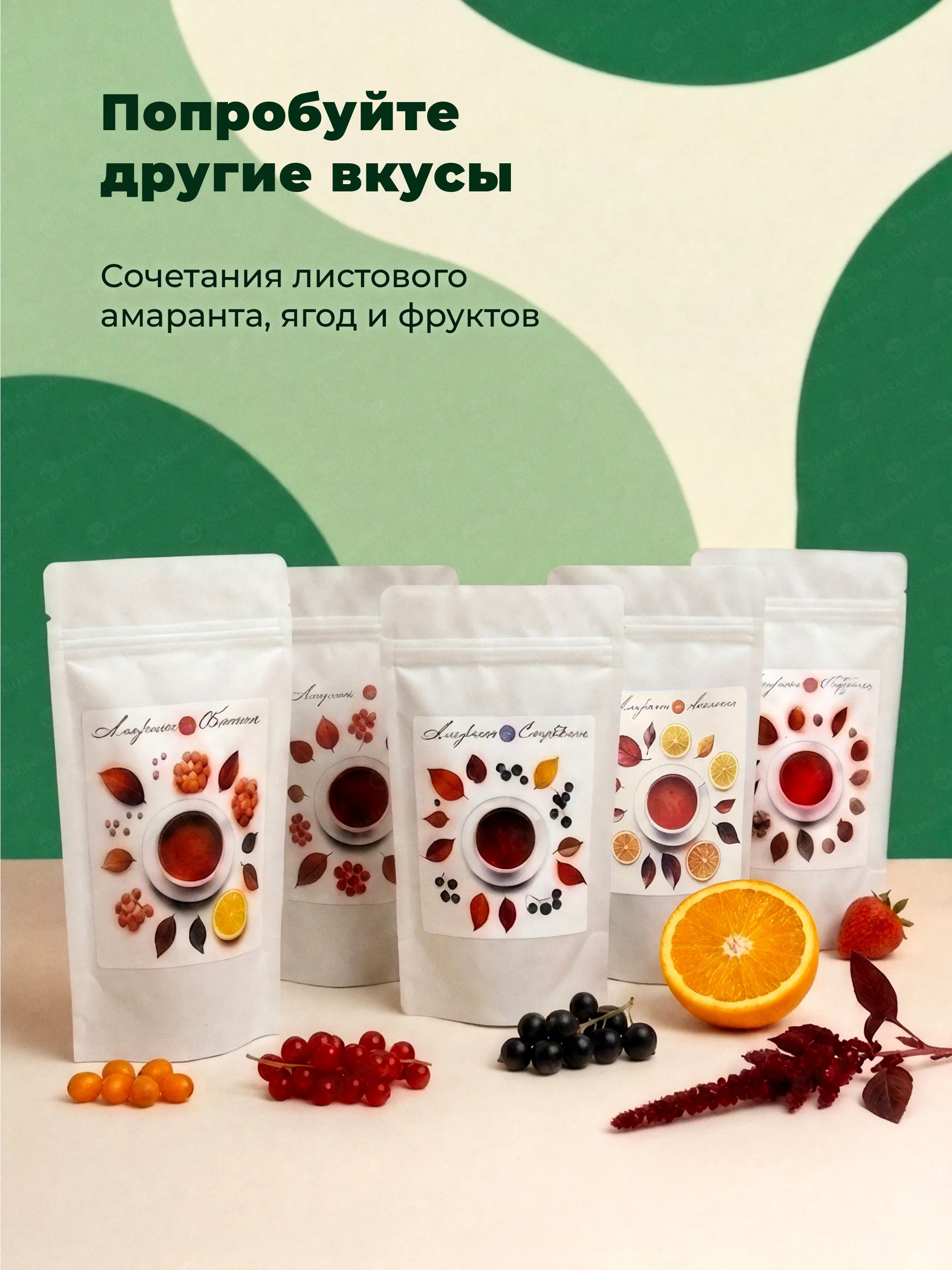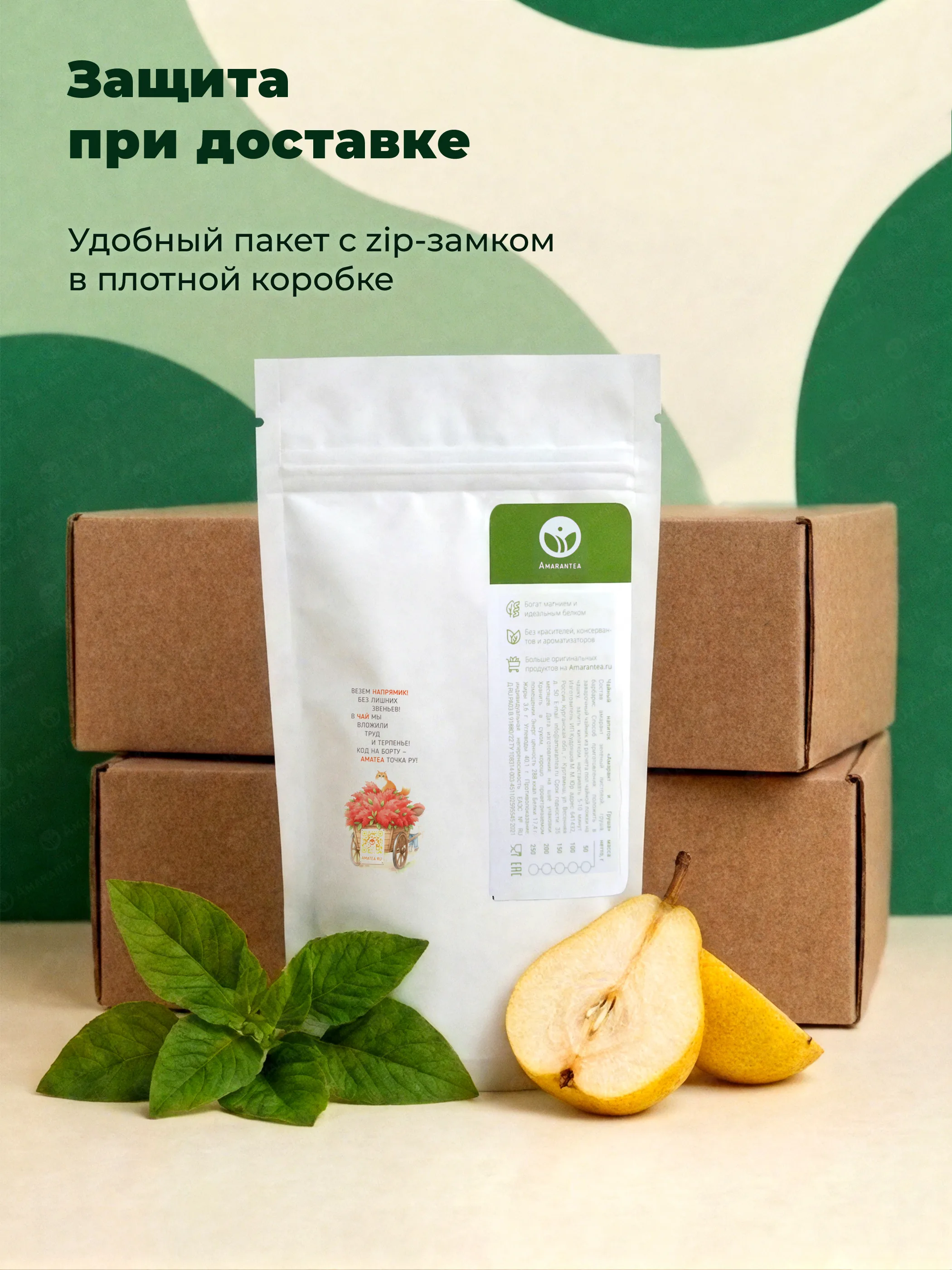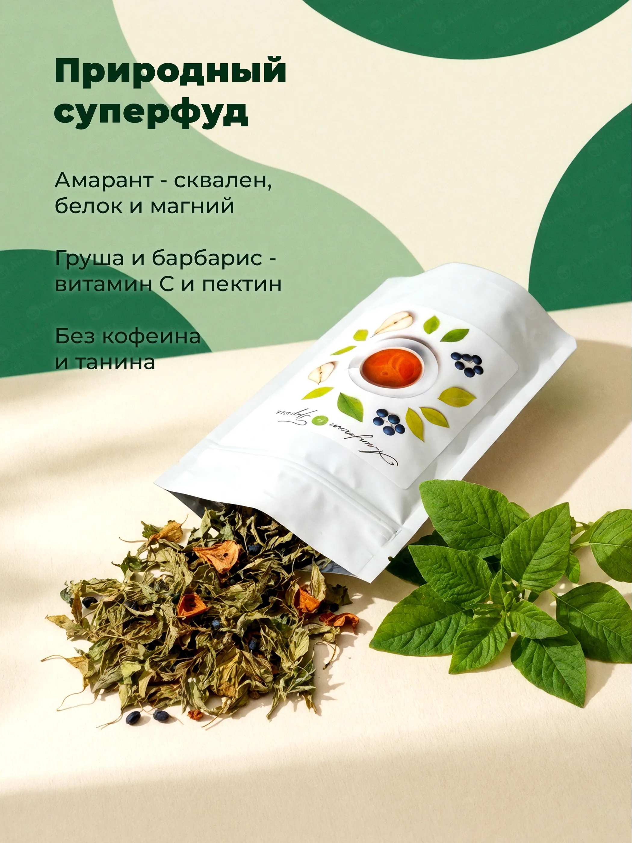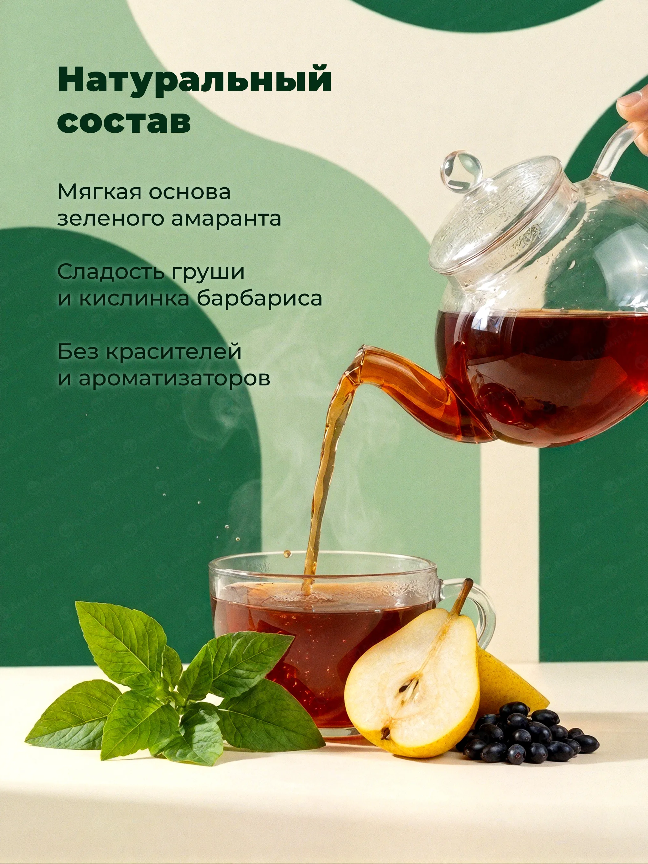 Только листовой зеленый амарант, сушеная груша и барбарис — без ароматизаторов и сахара.