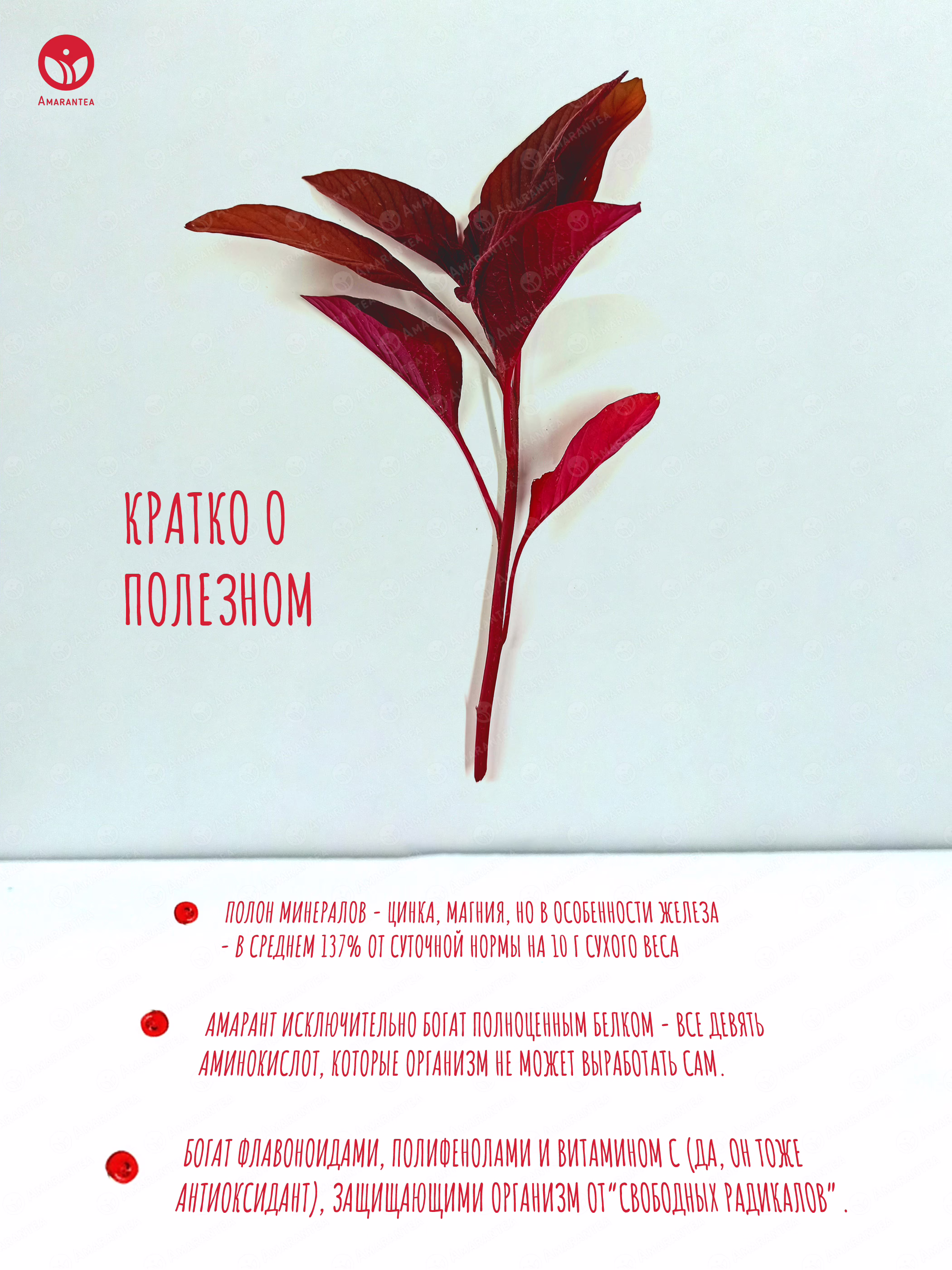 В этой пачке 100 грамм смеси, созданной на основе амаранта собственного выращивания и ягод красной смородины. Здесь нет сложных рецептов и искусственных добавок – только два простых ингредиента, объединенных вместе.