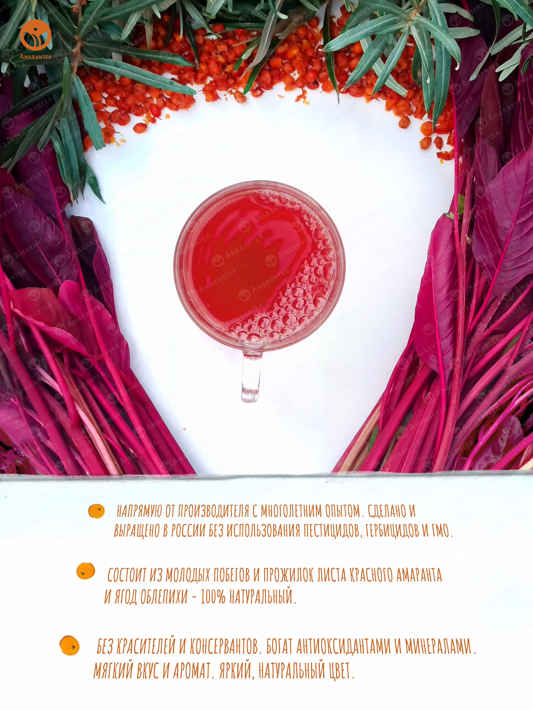 У облепихи специфический, узнаваемый характер. Она придает напитку яркий, мутноватый оттенок и специфическую маслянистую ноту во вкусе, которая смешивается с травяным тоном амаранта. Это не сладкий компот, а насыщенный функциональный напиток. Возможна индивидуальная непереносимость.