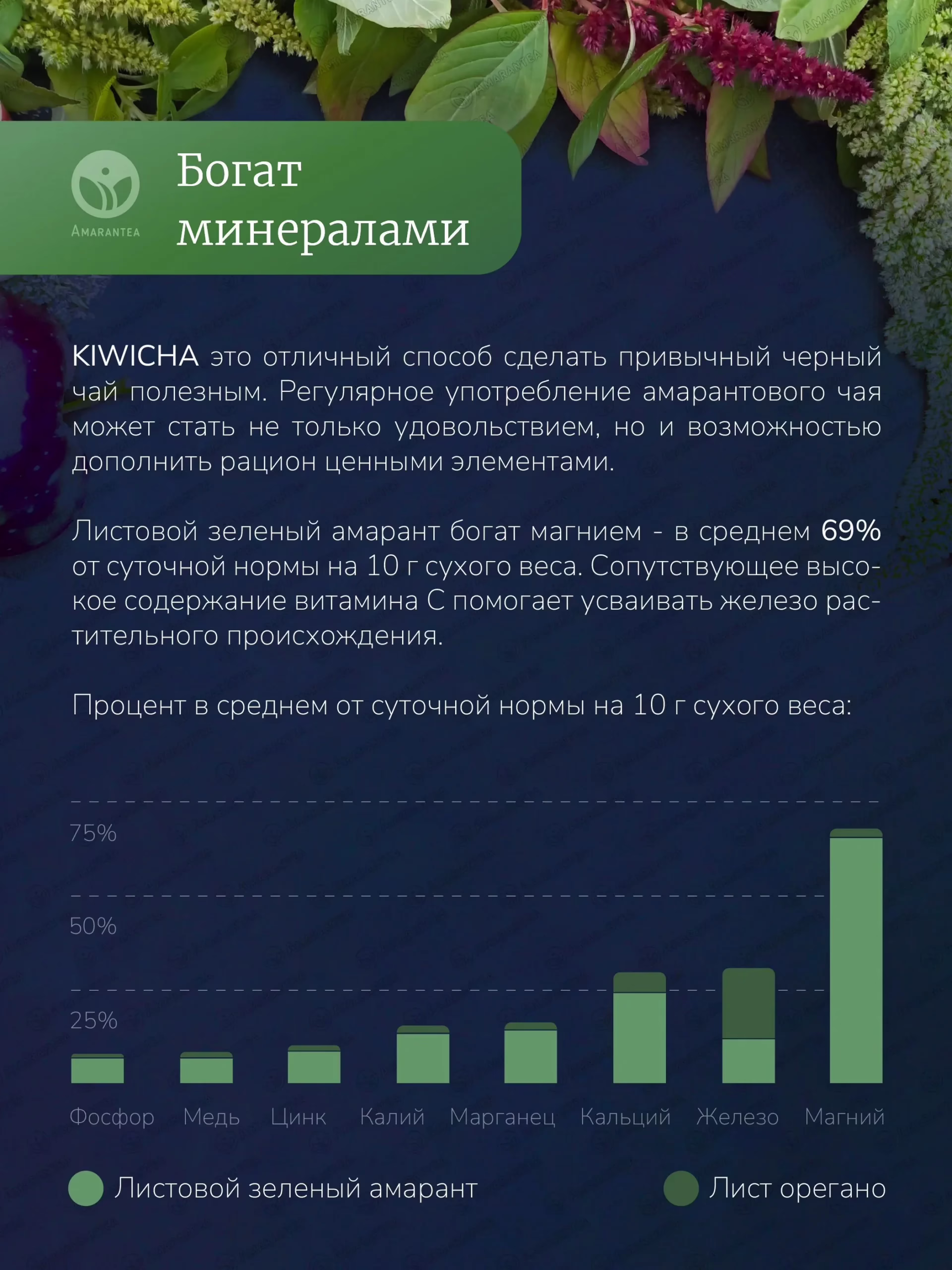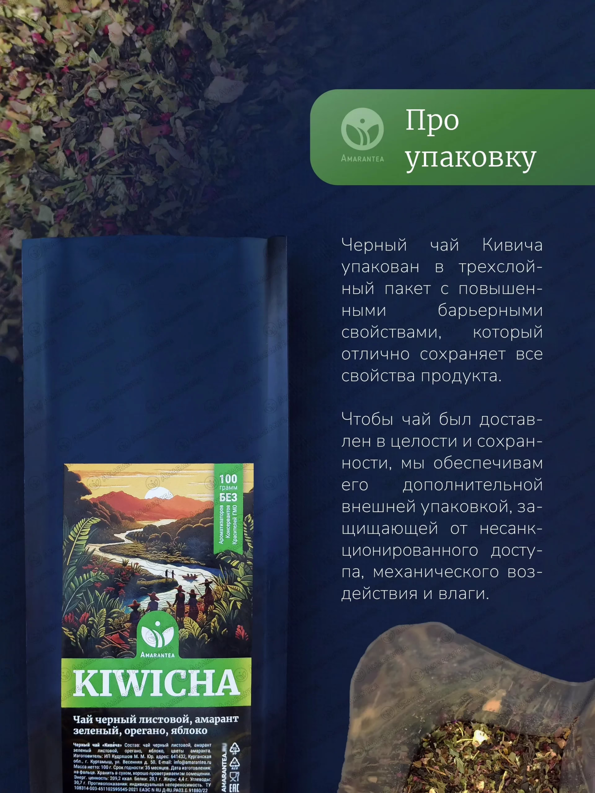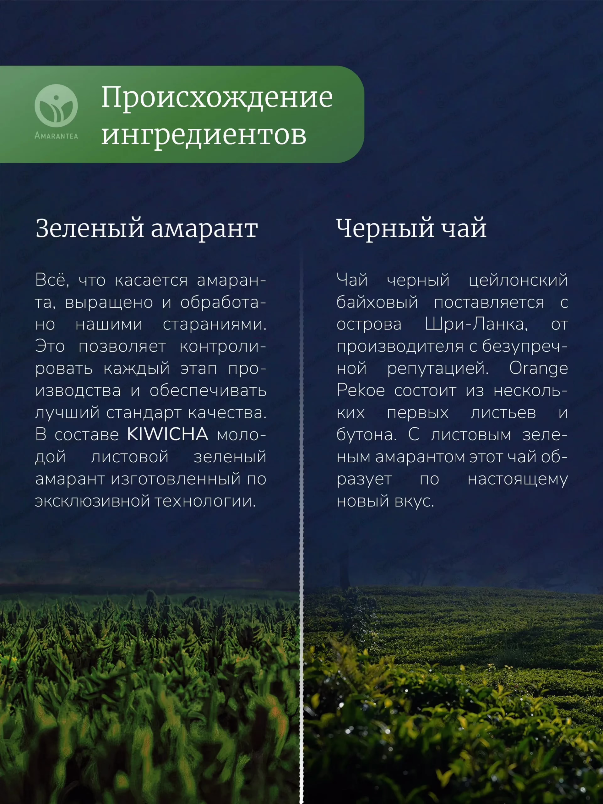 Черный чай PEKOE — это стандарт качества, где используются цельные, крепко скрученные молодые листья. Орегано (душица, природный антисептик) добавляет пряный аромат. Сушеные яблоки при заваривании дают натуральную фруктовую кислинку. Зеленый амарант — источник хлорофилла и лизина, поддерживающих иммунитет. KIWICHA настолько ароматный благодаря орегано и яблоку, что покупатель сразу поймет это «честный вкус».