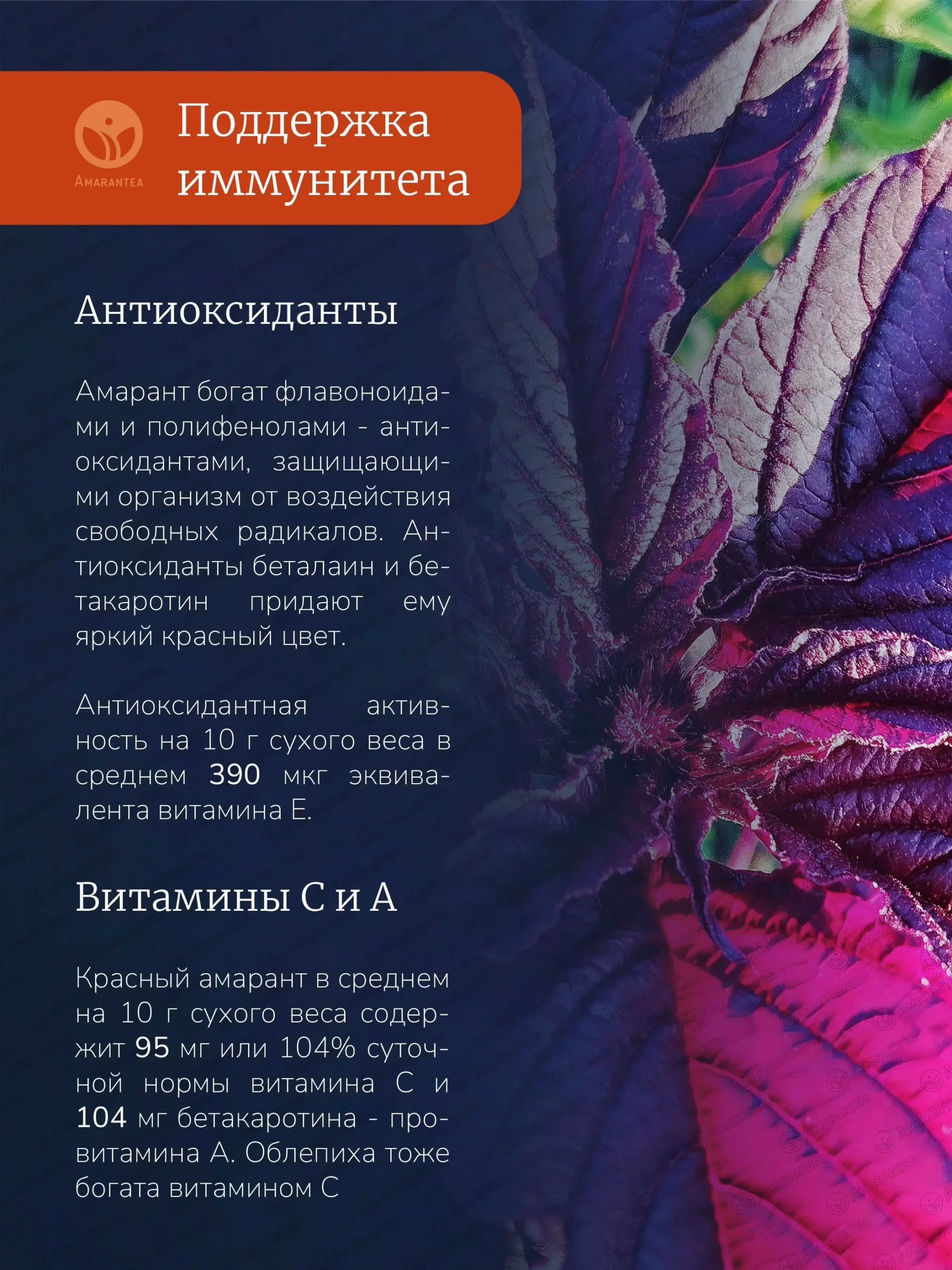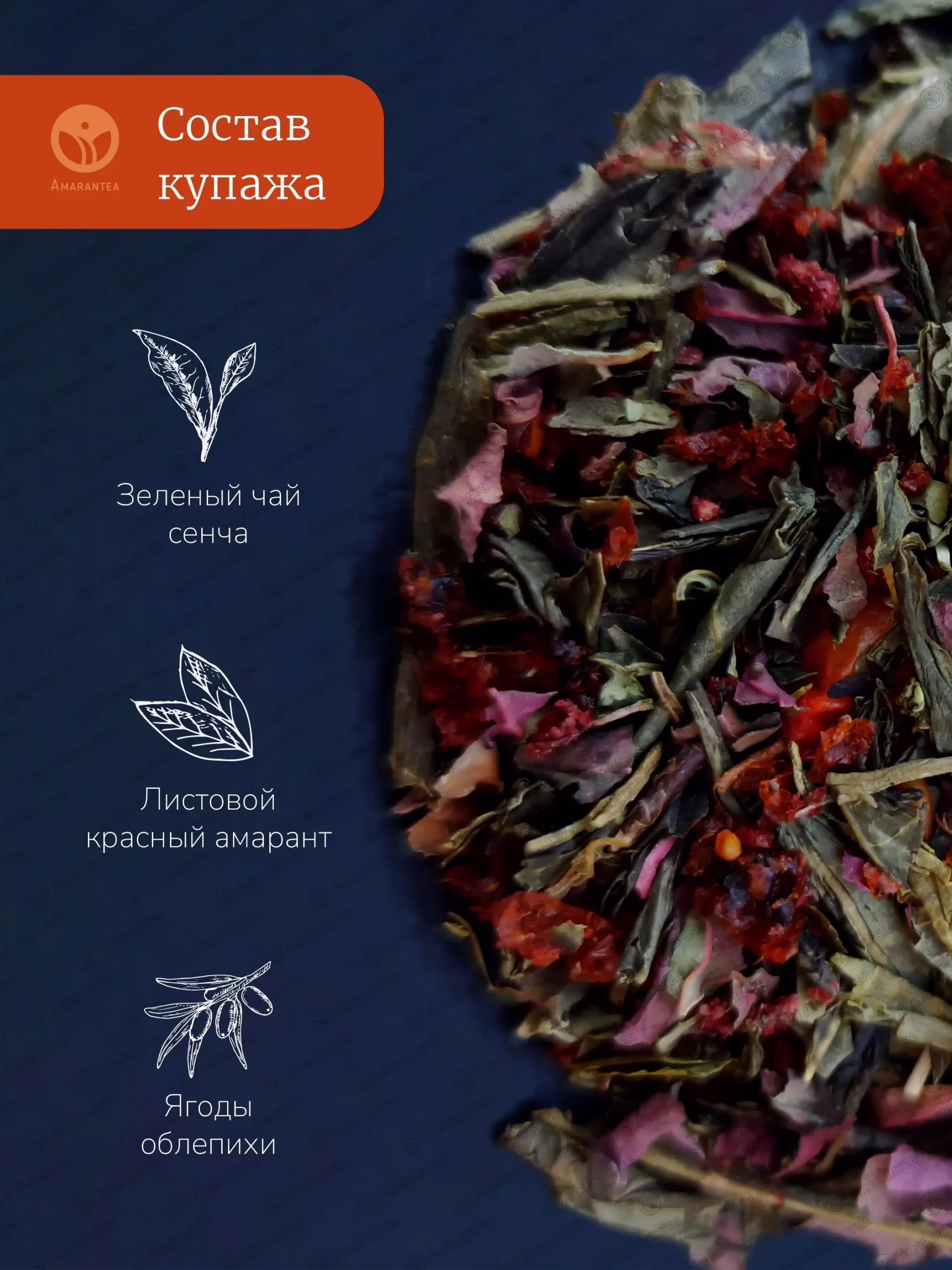 - Купаж на основе зеленого чая Сенча и красного амаранта